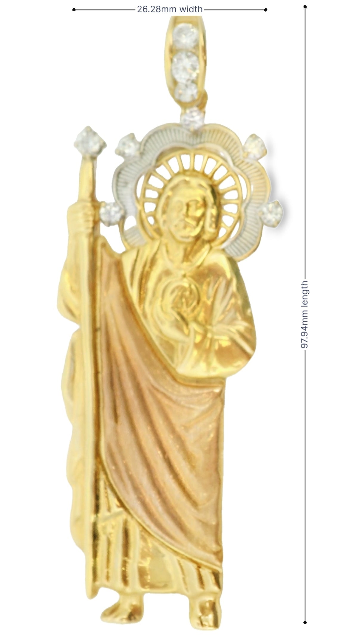 This 14K TRI COLOR ST.JUDE pendant features a length of 86.21MM from the bale and a width of 27.69MM. The three colors symbolize hope, faith, and love, making it a meaningful piece for men. Crafted with expert precision, it exudes a professional and sophisticated style. CZ