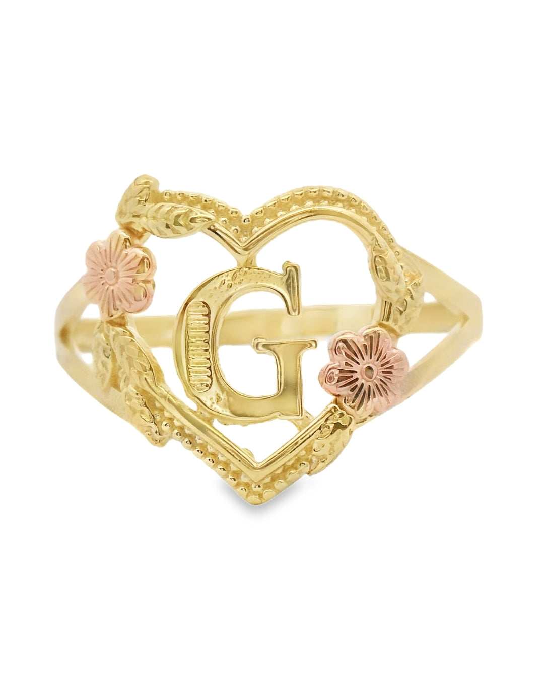 Expertly crafted in 14K yellow and pink gold, this heart initial G ring is a sophisticated addition to any woman's jewelry collection. The heart-shaped design and personalized initial G add a touch of elegance and individuality. Available in size 8, this ring is the perfect choice for a timeless and meaningful accessory.